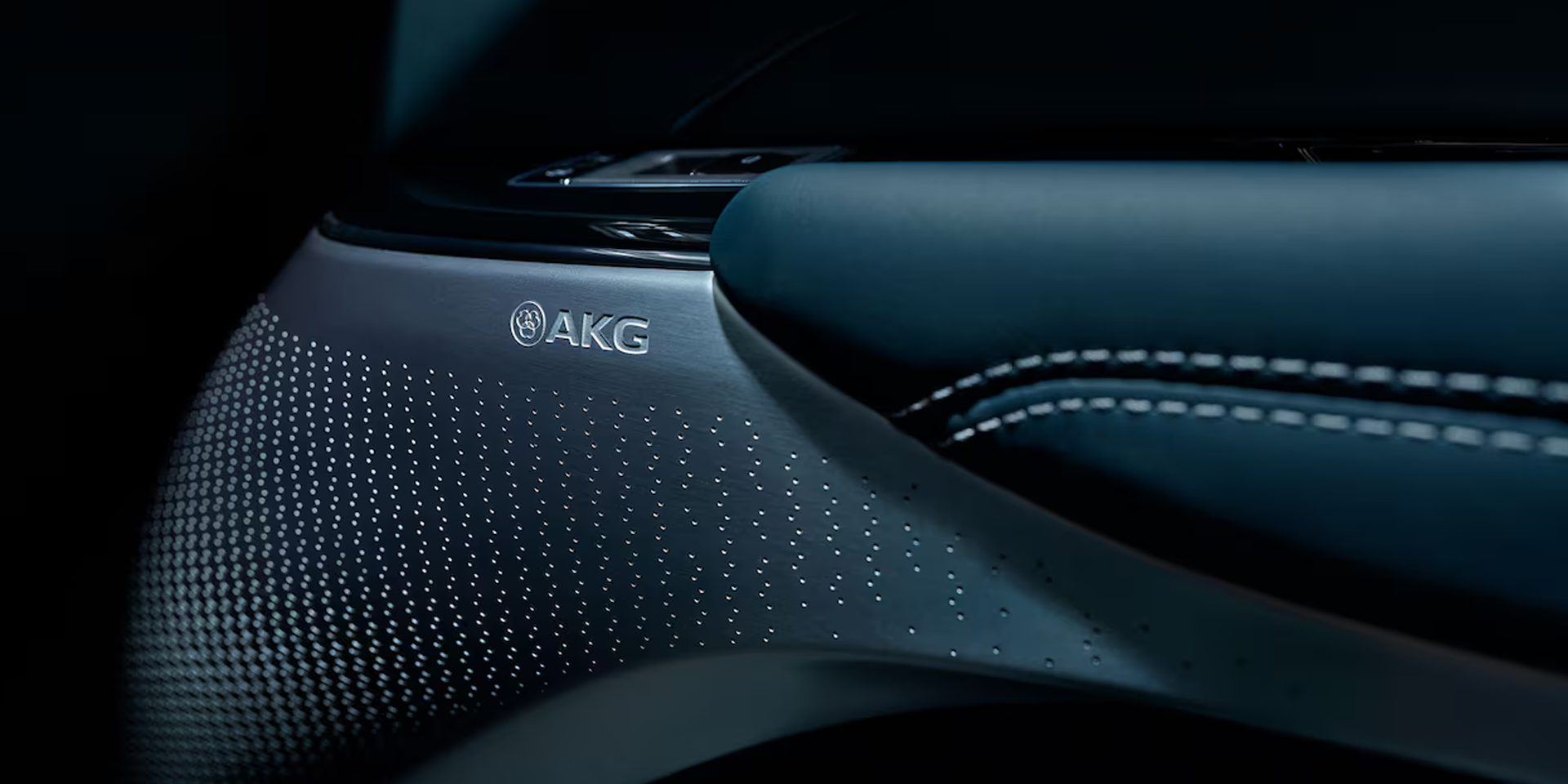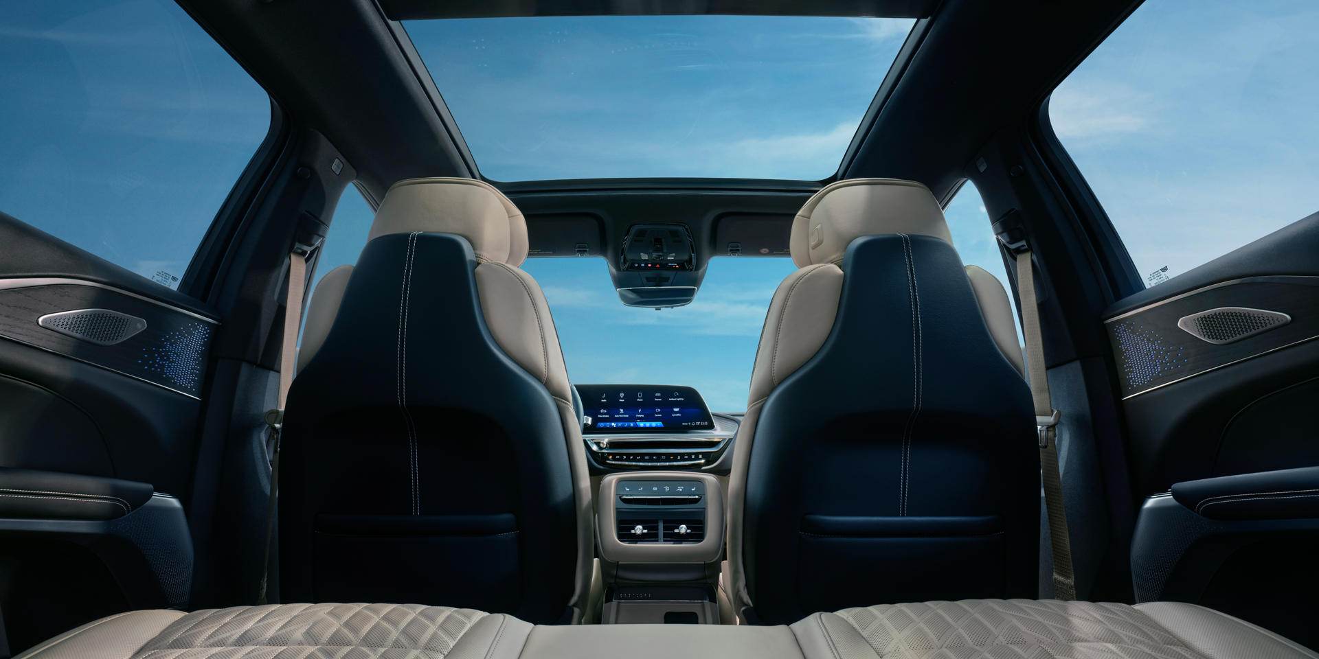 • Juniper Nappa Leather seating with perforated inserts and Sky Cool Gray piping, paired with Dark Ash genuine open pore wood décor and brilliant backlighting that filters through laser-etched wood patterns and alloy trimmed pedals